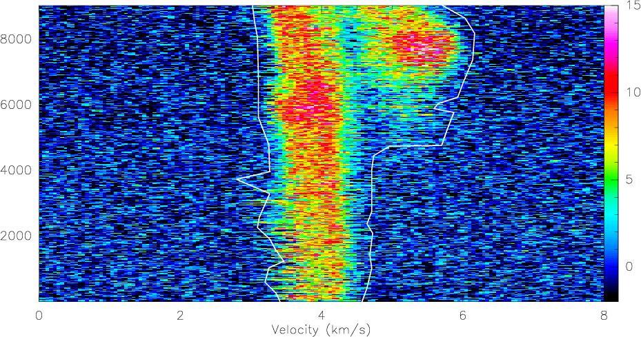 Other operations than visualization may benefit from the definition of the 2D array. The first coming in mind is baseline fitting. It is well known that this requires the separation of the spectrum channels between signal and baseline, in other words the definition of baseline windows. When dealing with a small number of spectra, the windows are often defined separately on each spectrum. When dealing with thousands of spectra, we still need to define windows adapted to each individual spectrum as large velocity gradients (e.g. in galaxies) may quickly move in frequency the separation between signal and baseline from one spectrum to another. However, defining windows on each individual spectrum is both impractical and inefficient as this does not take into account spatial homogeneity (really useful in case of moderately weak lines). We thus enable the definition of spectral windows directly on the 2D plot with polygons.